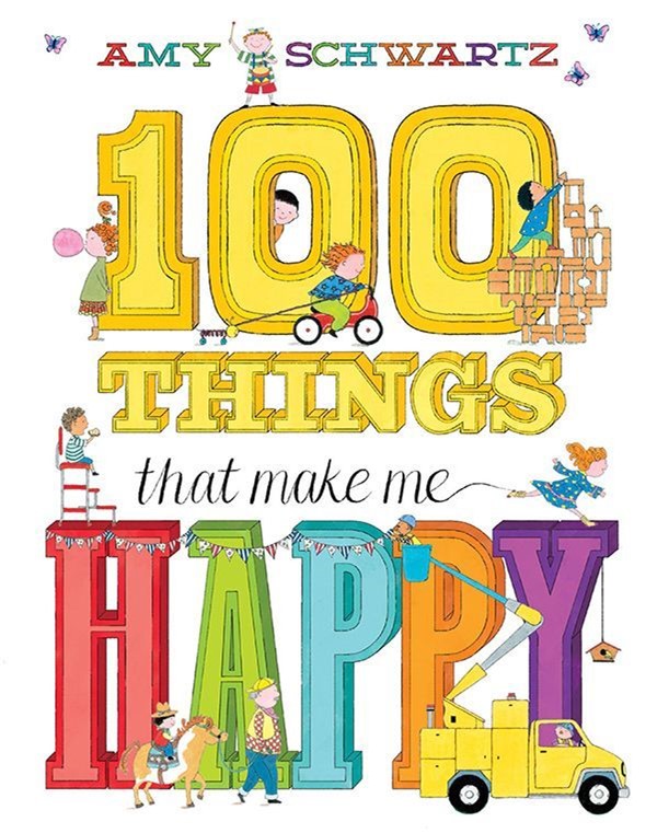 Hatum’s end paper illustrations also remind me of another book about joy – 100 THINGS that make me HAPPY. Amy Schwartz’s rhymes are list of things that bring delight. Many of those things aren’t things as much as they are experiences, like twirling in circles or sitting on Grandma’s lap for a story.  This title has extra value as a read aloud for elementary schools which celebrate the 100th day of school.